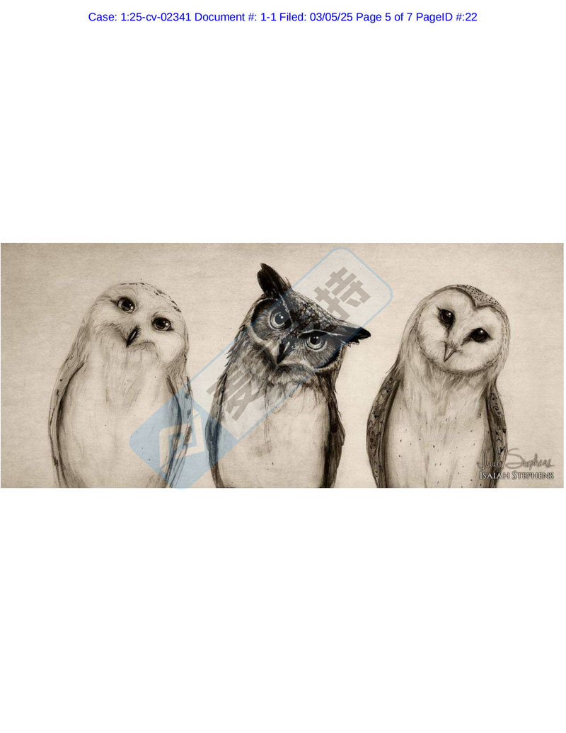 Keith律所新版权再度来袭,本次代理的品牌方为Isaiah Keith Stephens,涉案版权为VA 2-407-342,VA 2-407-350和VA 2-407-336三个作品,分别为猫头鹰和狐狸肖像画,均于2024年8月取得美国版权认证,未经授权使用均会面临TRO风险,跨境卖家速速排查下架。