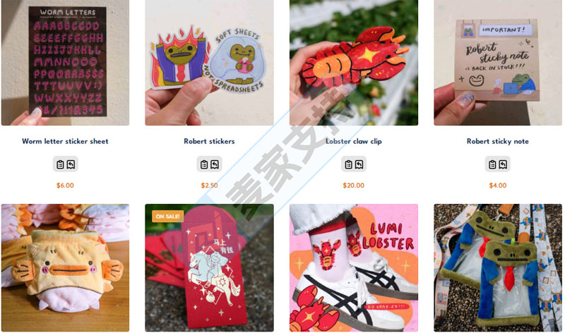 作为插画师,Arissa Rashid以rissaartt 为笔名,创作了多个病毒式传播的卡通形象,如以自己为原型的头顶小豆苗的少女 Bonky和反映当代职场状态的青蛙 Robert the Corporate Frog,其Telegram 表情包累计使用量已突破数百万次。除此之外,Arissa Rashid设计的沙丁鱼罐头发夹和龙虾发夹上架后就备受追捧,引发了大规模电商仿冒。