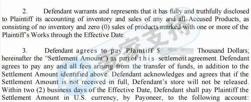 根据麦家支持常年积累的经验来看,大部分情况下需要走诉讼的案件,冻结金额大,侵权产品销售量低,案件处于初期如TRO期间,在PIO下来之前处理案件,是非常好的诉讼时间,一般能大大降低赔偿金(按惯例赔偿金30-50%或者更高的)。于是,趁着PIO还未下来,我们的律师首先准备了相关材料向法院提出应诉动议,随后一边联系对方律师进行心理战术谈判。案件处理前后仅用了3天时间就帮客户一下子节约了一大笔赔偿金额,最终两个店铺总计以低于3000美金(低于5%赔偿金)成功签订和解协议。