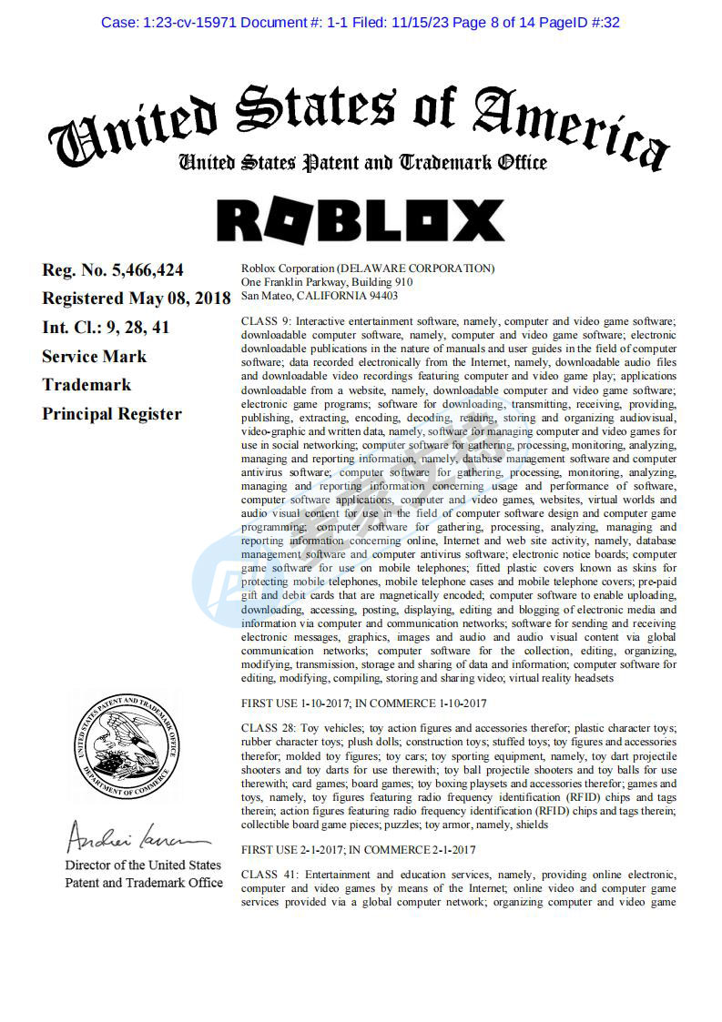 | 2023/10/12 | 23-cv-14818 | HSP | Roblox游戏 |