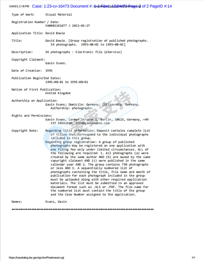 本次维权的是作品是关于Gavin Evans给英国著名摇滚歌手David Bowie大卫·鲍伊在1995年7月为《时代》杂志拍摄的照片,被称为“The Session”,该作品曾在维多利亚和阿尔伯特博物馆的“David Bowie”展览名单、2016年Sotheby的David Bowie艺术拍卖名单,甚至是《滚石》杂志的封面上出现。该作品于1995年拍摄完成,2021年下证,由于原告方并为公布版权详情图,暂不得而知具体图片是哪一张,但是经小编在亚马逊等平台搜索发现,有许多高危产品在售,跨境卖家需谨慎排查。